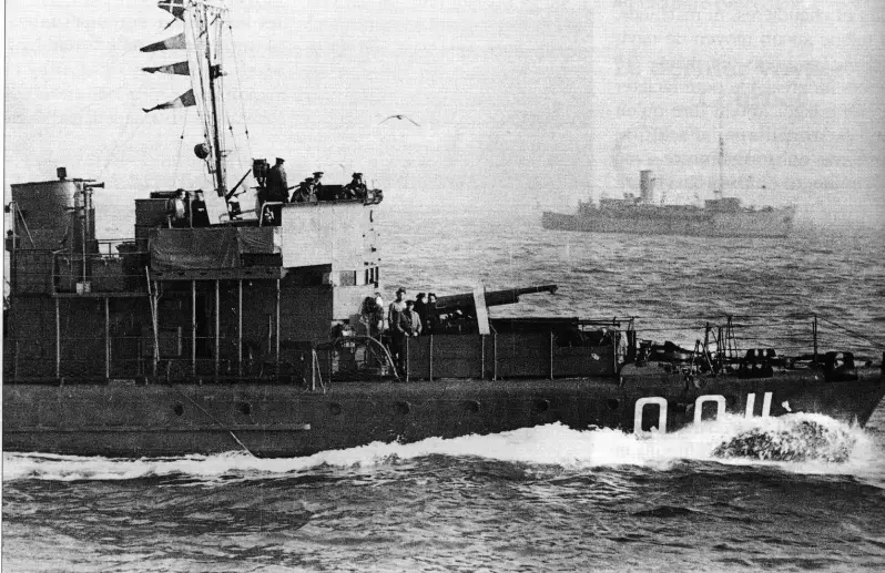 Chasseur 14 Dielette under the Royal Navy white ensign
